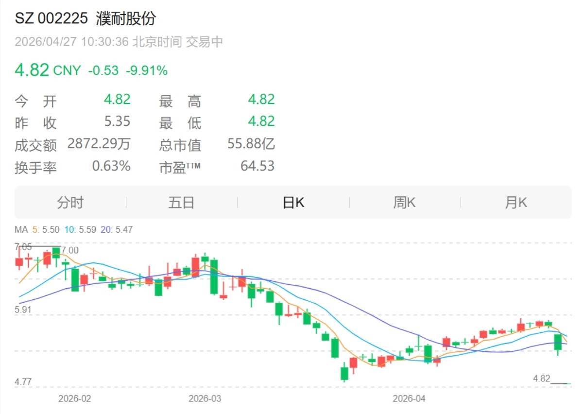 【大河财立方消息】4月24日晚,濮耐股份公告称公司因涉嫌走私被起诉。濮耐股份今日开盘一字跌停,股价报4.82元,封单额1.45亿元。