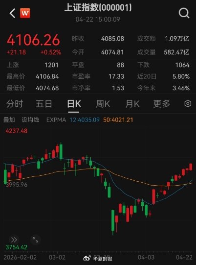 2026年4月22日,A股三大指数集体收涨,上证指数实现五连阳,重返4100点之上;创业板指大涨逾1.7%,一举站上3700点,再创逾十年新高。